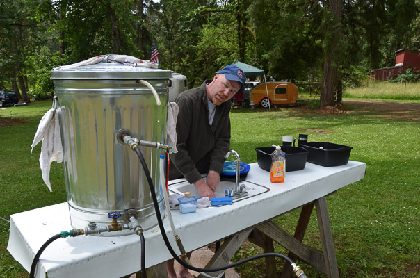 This is Larry's campfire-powered hot water heater for dishes.